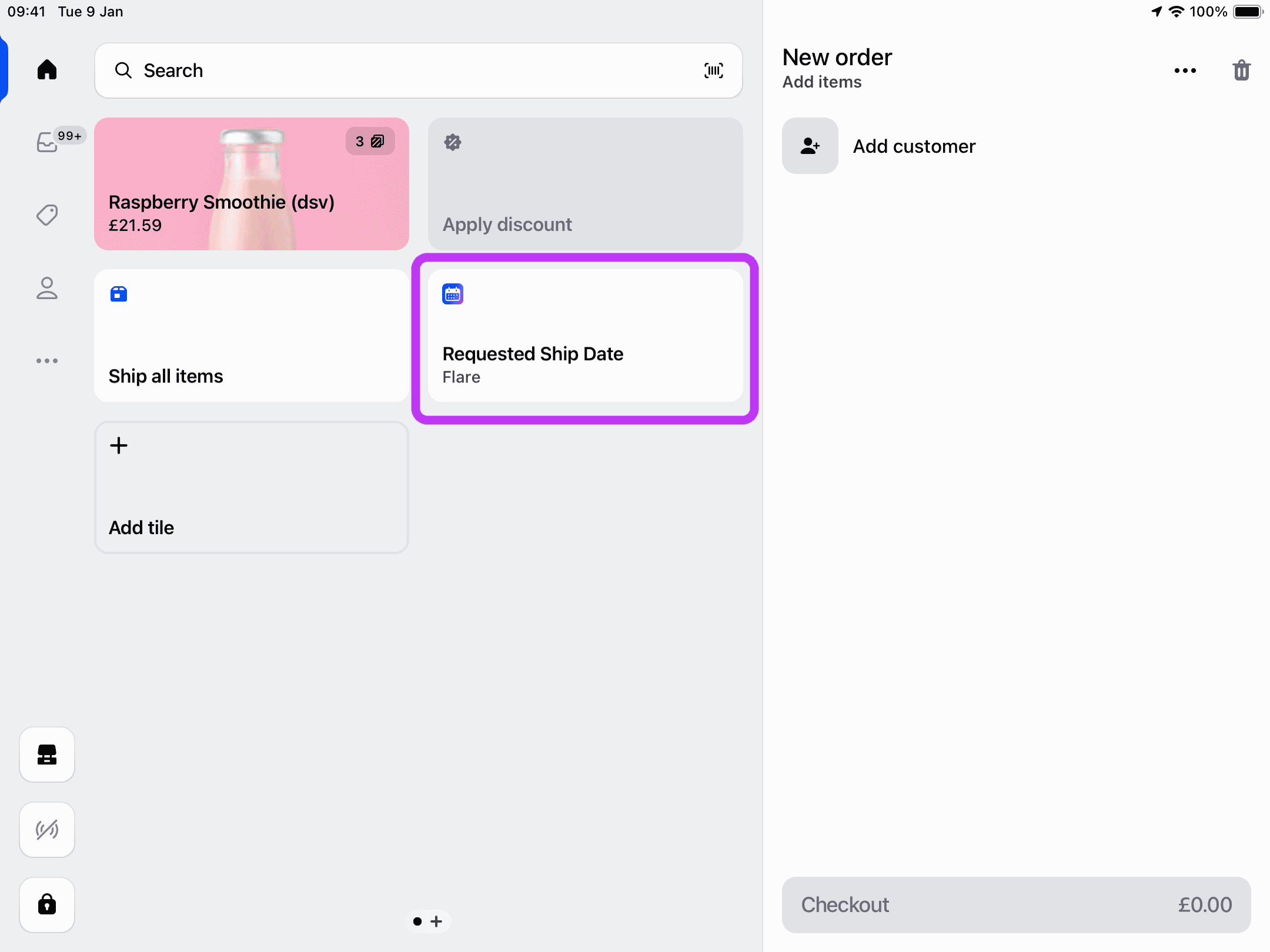 Staff using Shopify POS with delivery date picker shown on iPad checkout screen.