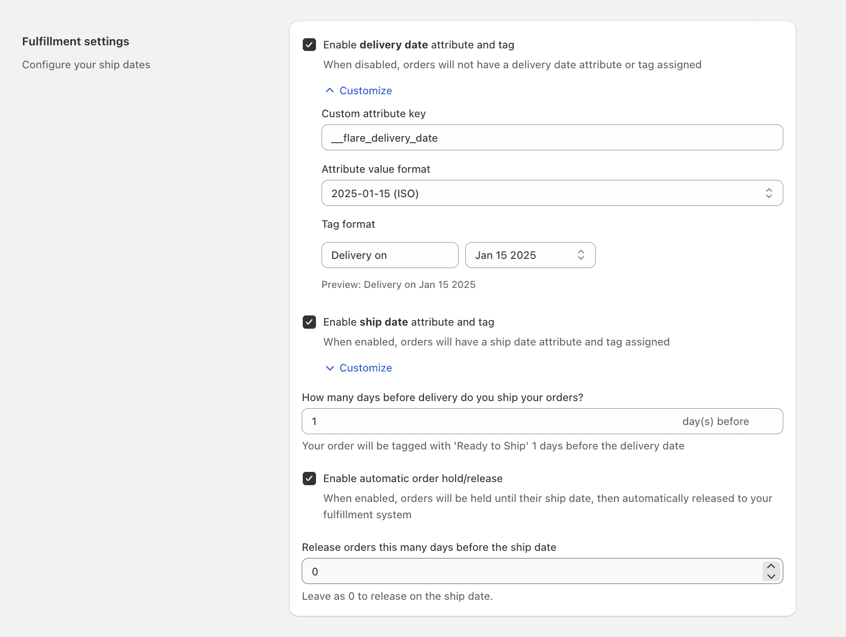 Set your date order attributes and order tags formats and let the Shipping Calendar handle the rest by date, shipping method and fulfillment status.
