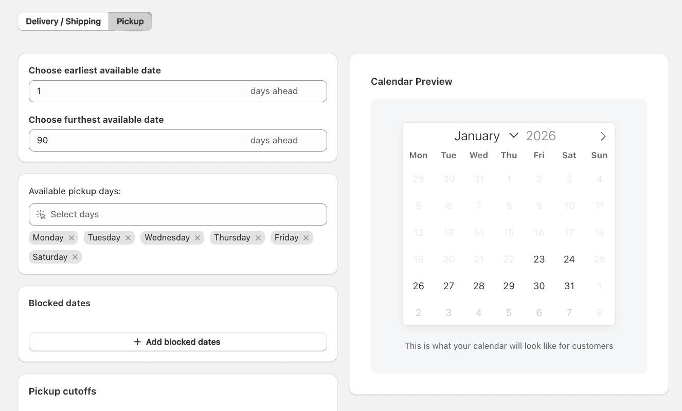 Store pickup is same-day. Local delivery within 10 miles is next-day. National shipping is 5-7 days. Each fulfillment method has different lead times. but Shopify shows one date for all. Customers choosing pickup see 5-day delivery estimate and question why they can't collect today. Method-specific dates show realistic availability for each option. increasing conversions for faster fulfillment types.