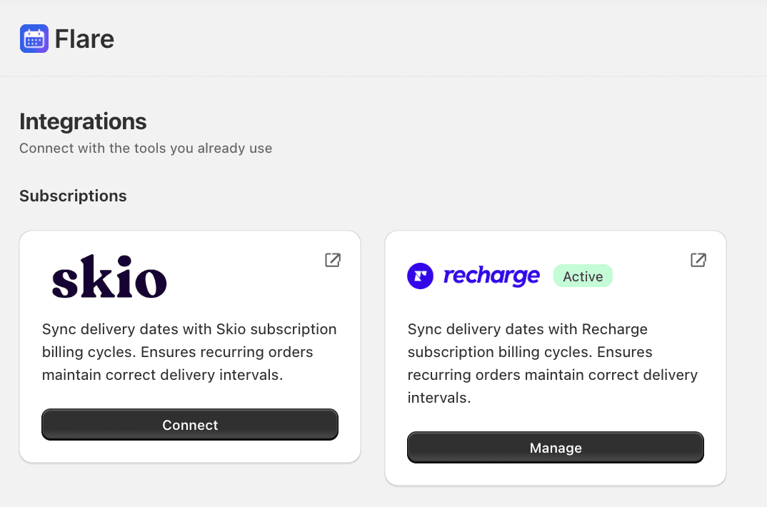 Native API integration with Skio and Recharge for full delivery date control and data sync. Works with Appstle Recurpay and other Shopify subscription apps with more API integrations launching soon.